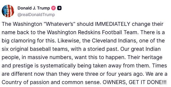 “Donald J. Trump Truth Social 07.20.25 03:35 PM EST My statement on the Washington Redskins has totally blown up, but only in a very positive way. I may put a restriction on them that if they don’t change the name back to the original “Washington Redskins,” and get rid of the ridiculous moniker, “Washington Commanders,” I won’t make a deal for them to build a Stadium in Washington. The Team would be much more valuable, and the Deal would be more exciting for everyone. Cleveland should do the same with the Cleveland Indians. The Owner of the Cleveland Baseball Team, Matt Dolan, who is very political, has lost three Elections in a row because of that ridiculous name change. What he doesn’t understand is that if he changed the name back to the Cleveland Indians, he might actually win an Election. Indians are being treated very unfairly. MAKE INDIANS GREAT AGAIN (MIGA)!” 1:16 PM · Jul 20, 2025, 565.8K (qtd in The Sporting News, July 21).